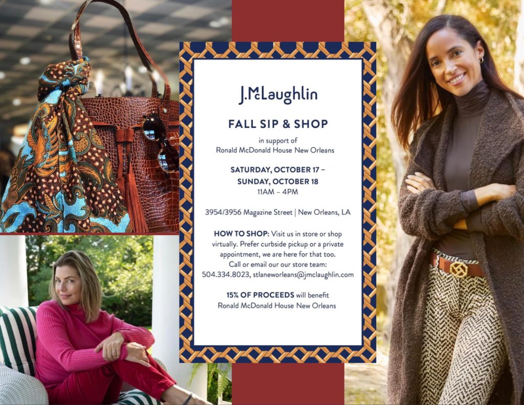 J. McLaughlin is holding a Fall Sip & Shop in support of Ronald McDonald House Charities of South Louisiana on Saturday, October 17-Sunday, October 18, ...