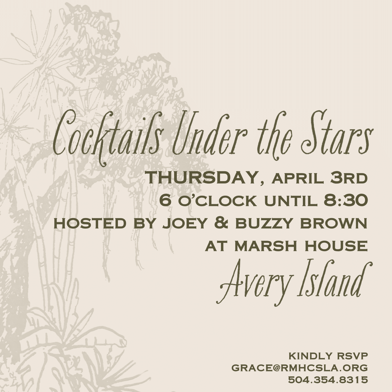 The Marsh House 4 Pepper Field Road, Avery Island, United StatesJoin us as for an evening under the stars at Avery Island's gorgeous Marsh House, hosted by Joey & Buzzy Brown.