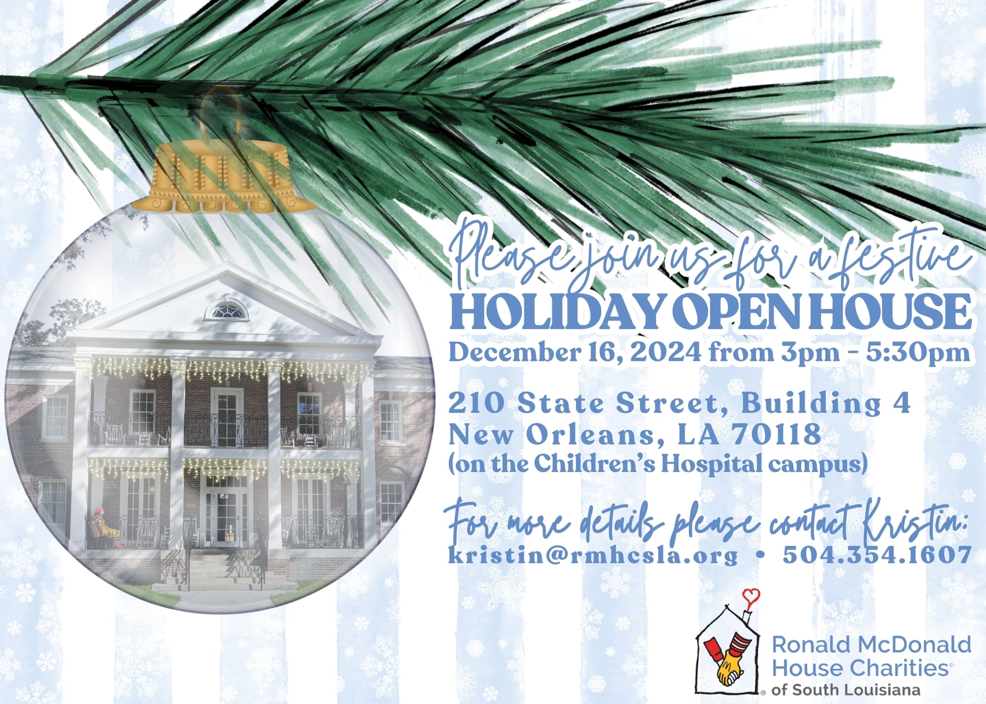 New Orleans Ronald McDonald House 210 State Street Building 4, New Orleans, LA, United StatesCome enjoy the festive feeling at our House and enjoy hot cocoa, cookies & other seasonal delights!